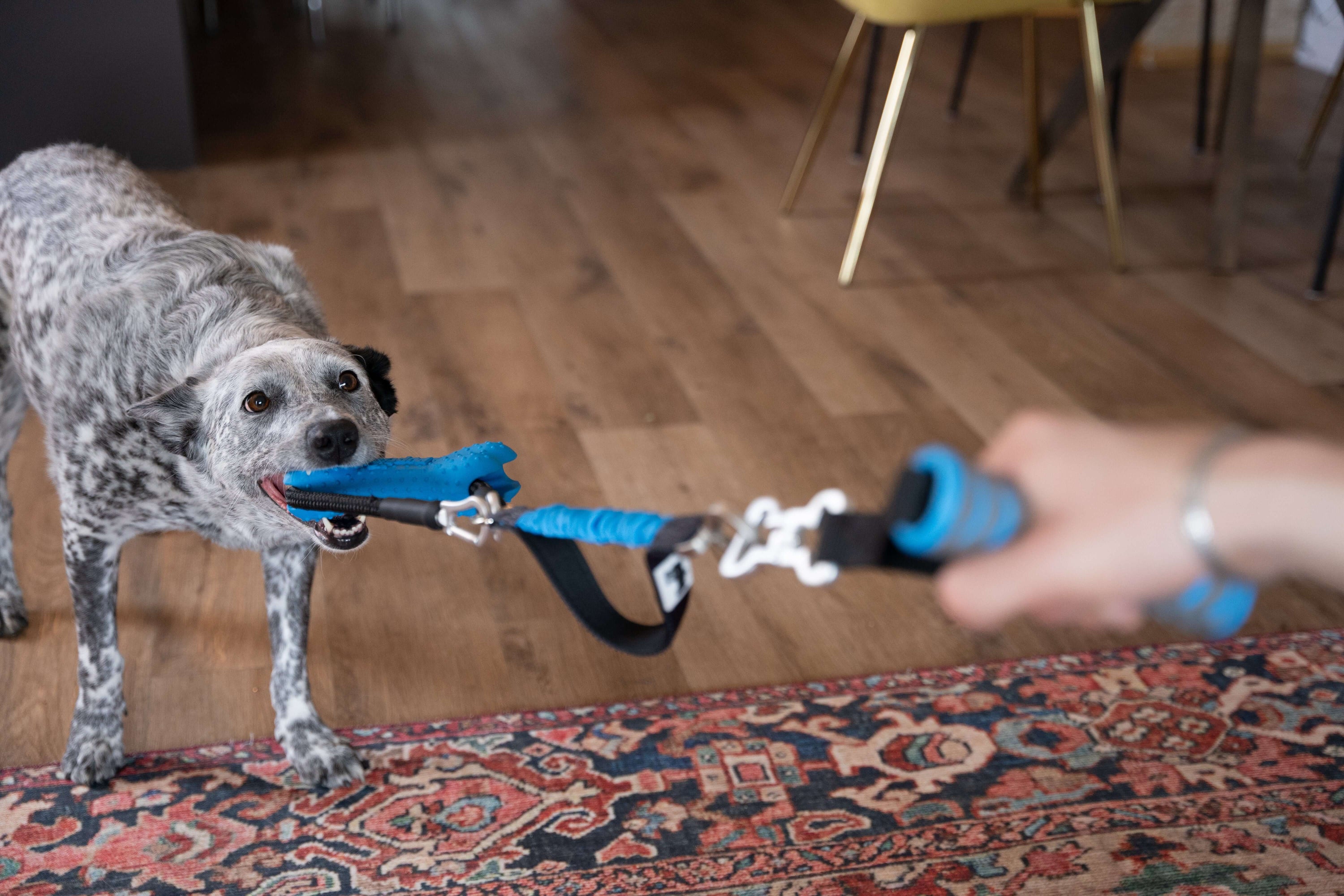 Learn MoreThe utility bungee can be used as a primary or secondary leash handle and offers elasticity during walks as well as some resistance during tug play. It's also an easy fit collar for your dog and can be placed around your ankles and arms as a tug toy for various workouts.